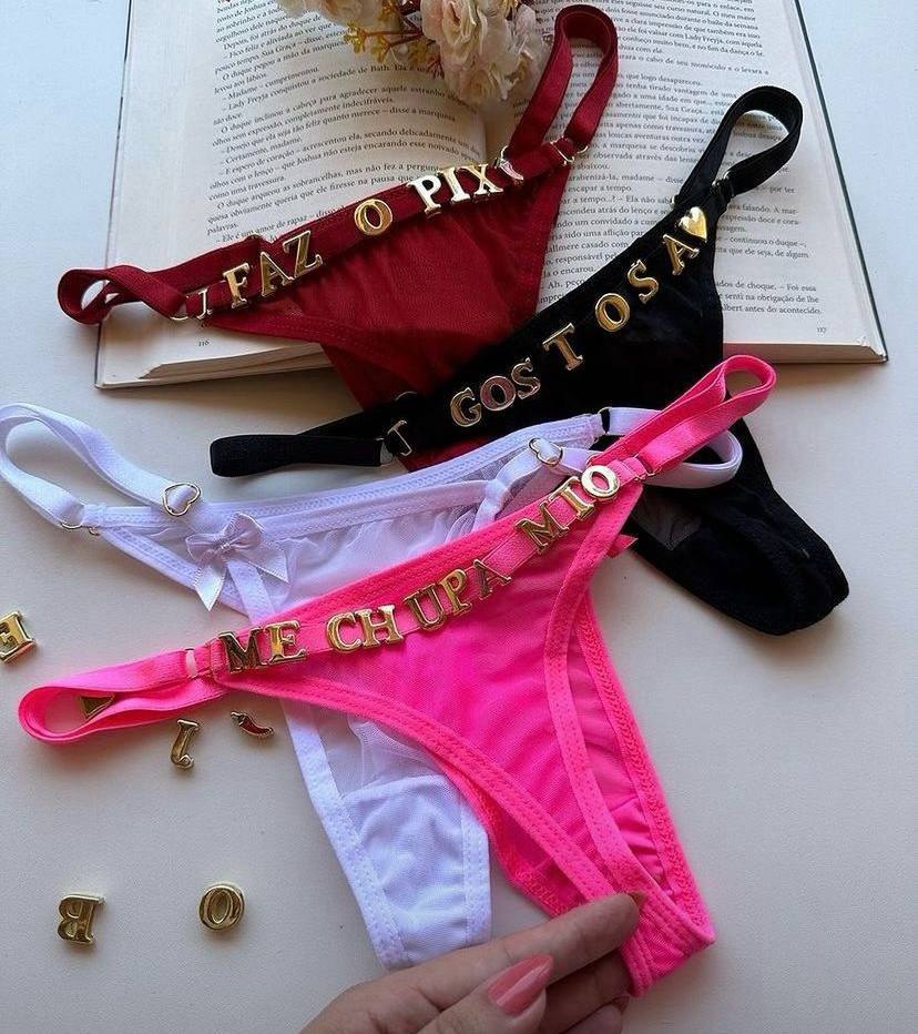 Confeccionada em tule liso e leve, sua modelagem string fio dental valoriza o corpo com sensualidade e conforto, enquanto o destaque fica por conta da alça traseira com espaço para letras avulsas, onde você pode criar frases divertidas, provocantes ou românticas — do seu jeito.